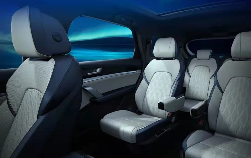 Автомобиль получит качественный салон с сине-белыми сиденьями и большой панорамной крышей. По сравнению с семиместной версией шестиместная модель имеет компоновку 2 + 2 + 2. В середине второго ряда сидений есть проход, по которому можно попасть на третий ряд, не перемещая второй.
