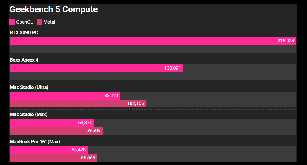 Как можно видеть, тест Geekbench OpenCL демонстрирует двукратное превосходство флагмана Nvidia над новинкой Apple. При этом при удвоенном количестве ядер GPU в M1 Ultra лишь на 30% быстрее M1 Max.