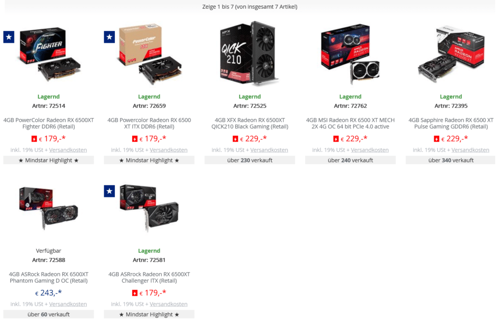В Германии ранее уже фиксировался случай продажи Radeon RX 6500 XT по цене ниже рекомендованной, но тогда речь шла об относительно небольшом количестве видеокарт. А сейчас тот же магазин снизил стоимость Radeon RX 6500 XT ещё сильнее — до 180 евро. Такими дешёвыми Radeon RX 6500 XT в Европе никогда не были.