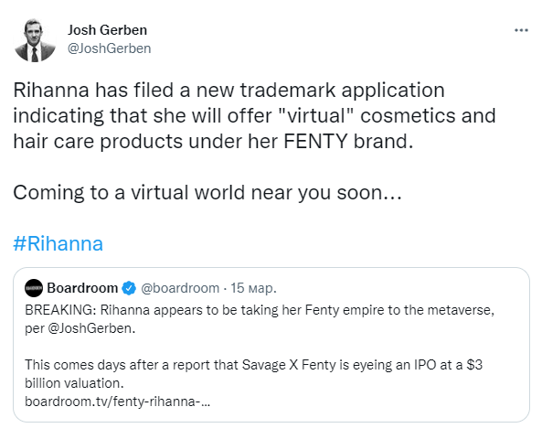 Тем временем певица Рианна (Rihanna) планирует продавать свою виртуальную косметику в метавселенной.