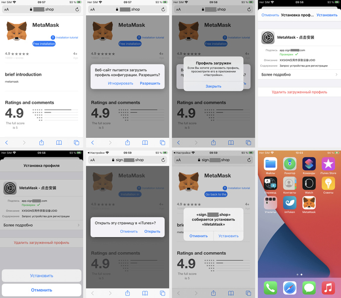 В зависимости от типа устройства, с которого посещаются поддельные сайты, пользователям предлагается загрузить и установить версию кошелька для соответствующей платформы — Android или iOS. Загрузка Android-версий троянов чаще всего происходит непосредственно с посещённого вредоносного ресурса. При этом владельцы iOS-устройств обычно перенаправляются на другой сайт, оформленный в стиле официального каталога приложений Apple.