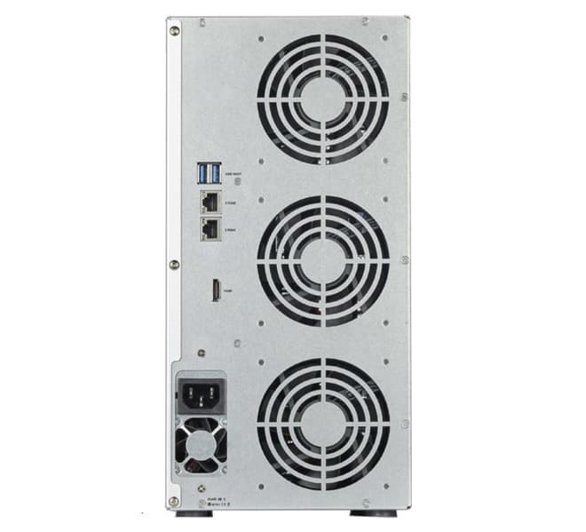 В эти отсеки можно устанавливать жёсткие диски типоразмера 2,5 и 3,5 дюйма с интерфейсом SATA суммарным объёмом до 240 ТБ ( 12 х 20 ТБ). Кроме того, есть два слота M.2 для кеширующих твердотельных накопителей с поддержкой NVMe. Хранилище поставляется с 8 ГБ памяти DDR4 SODIMM, которую можно увеличить до 32 ГБ (2x 16 ГБ), устанавливая модули в два слота. Оснащение NAS включает два сетевых порта 2,5GbE с поддержкой Link Aggregation.