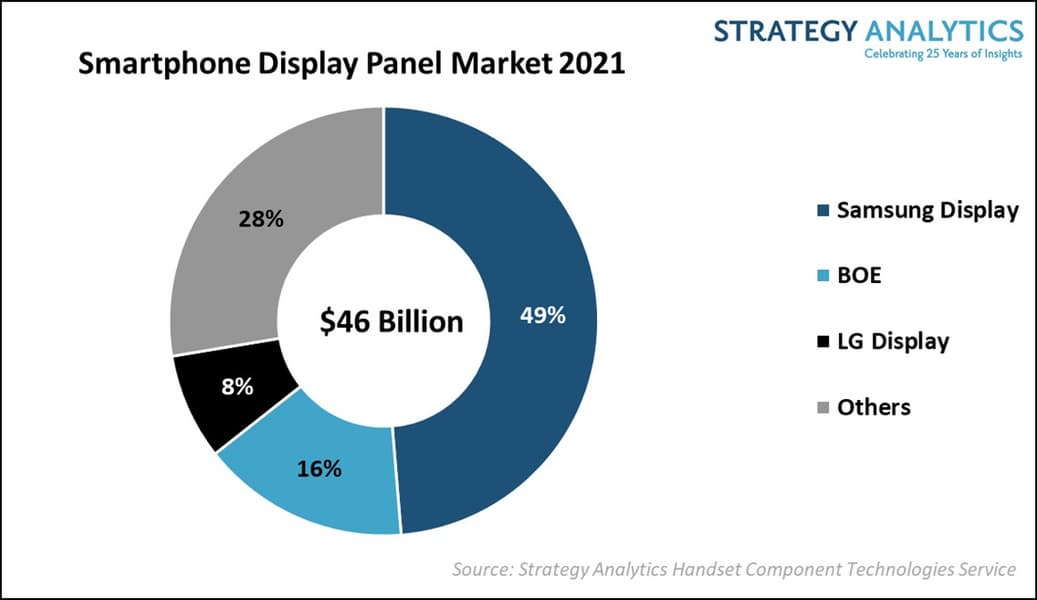 На указанном рынке с большим отрывом от ближайшего конкурента лидирует Samsung Display. Один этот производитель в 2021 году получил 49% всей выручки. За ним следует BOE Technology с 16%. Замыкает первую тройку LG Display с 8%.