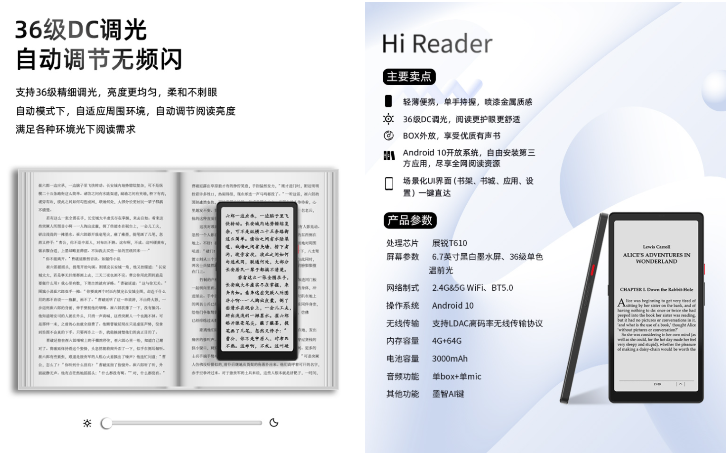 Электронная книга может адаптироваться к окружающей среде в автоматическом режиме, регулируя яркость чтения и удовлетворять потребности в чтении при различном окружающем освещении. Hisense Hi Reader оснащена 8-ядерным процессором Unisoc T610 с частотой 1,8 ГГц, встроенной батареей ёмкостью 3000 мА•ч. Он работает под управлением Android 10 и позволяет устанавливать сторонние приложения.