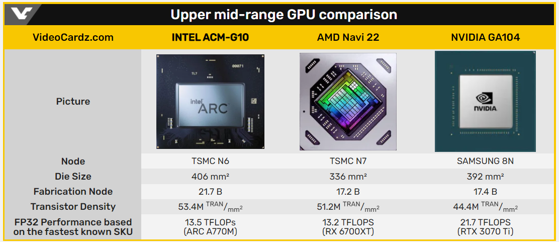 Как сообщается, GPU ACM-G10, который ранее мы знали под именем DG2-512, имеет площадь 406 мм2 и содержит 21,7 млрд транзисторов. То есть он крупнее, чем Navi 22 и GA104, и имеет ощутимо больше транзисторов. Кроме того, плотность транзисторов у него также выше.