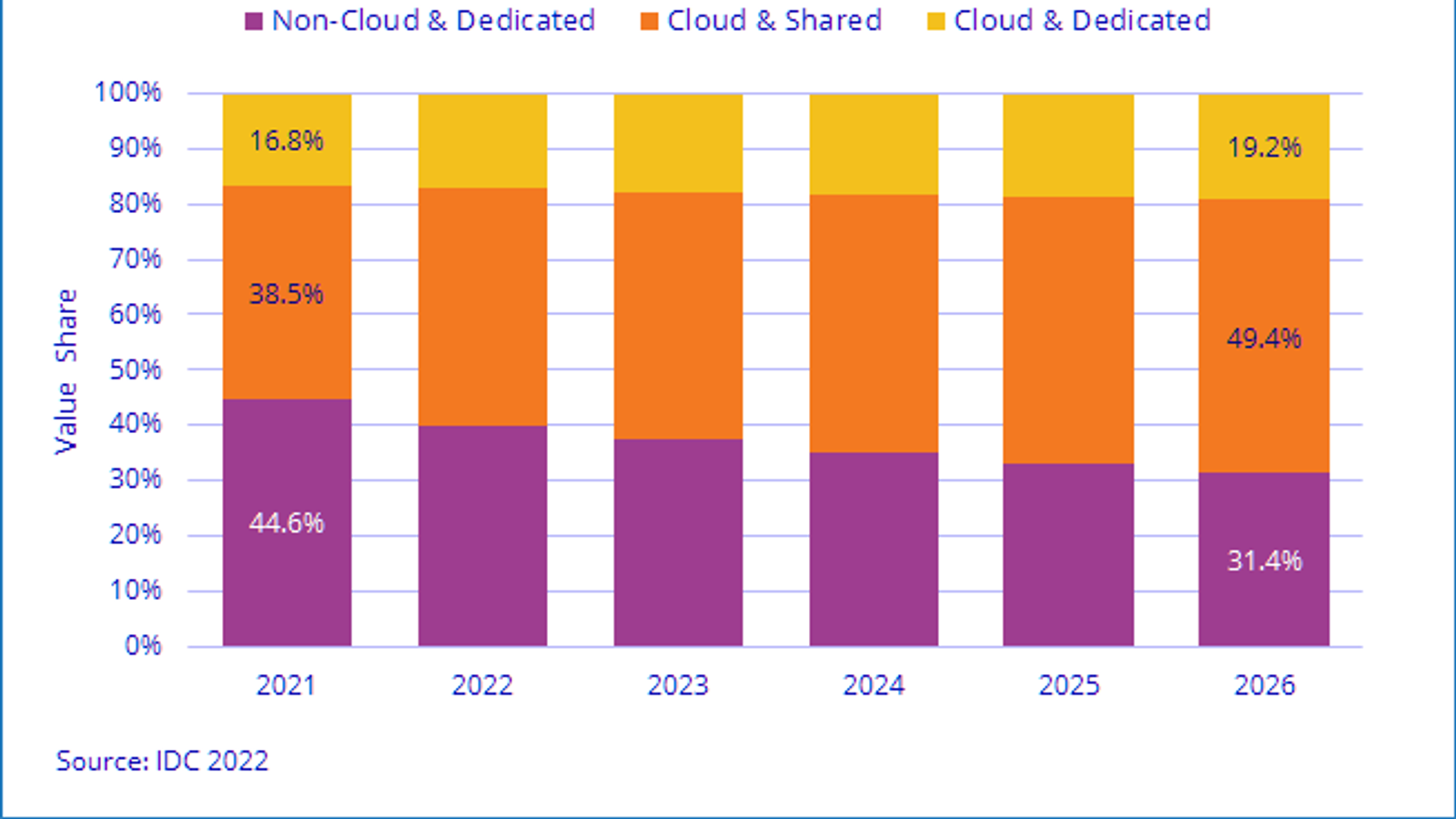 На 2022 специалисты IDC прогнозируют рост на 21,7%. Если этот прогноз сбудется, в текущем году рынок составит 90,0 млрд долларов. Что касается инфраструктуры, не относящейся к облачным вычислениям, расходы на неё в 2022 году сократятся на 0,3%, до 59,4 млрд долларов.