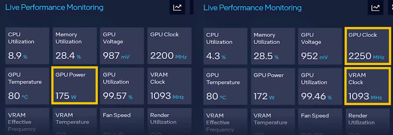 На это указывает сразу несколько параметров. Во-первых, частота GPU в 2250 МГц. Тут стоит оговорить, что для мобильных карт такие частоты не заявлены, но тесты показывают, что под нагрузкой даже младшие карты способны достигать таких значений. Во-вторых, значение GPU Power, равное 172–175 Вт. Это больше, чем у любой мобильной видеокарты Arc. В-третьих, частота памяти 1093 МГц, что означает эффективную частоту 17,5 ГГц. У мобильных адаптеров это значение равно 16 ГГц.