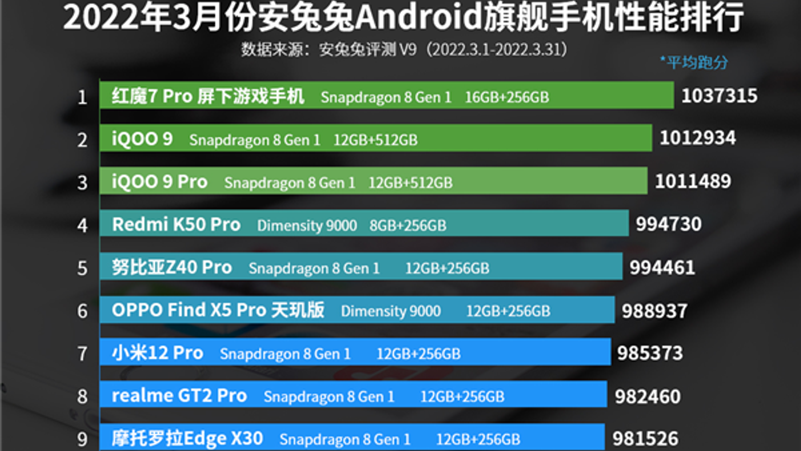 Собственно, в рейтинге не одна, а сразу две модели на Dimensity 9000, и обе — новинки. Только Oppo Find X5 Pro находится чуть ниже — на шестом месте. Интересно, что Redmi K50 Pro в мартовском рейтинге оказался и самым мощным смартфоном Xiaomi, потому что и Xiaomi 12 Pro, и Redmi K50 Gaming Edition, основанные на Snapdragon 8 Gen 1, в рейтинге расположены ниже. Очевидно, что по мере выхода других флагманов на Dimensity 9000 модели на Snapdragon 8 Gen 1 будут вытесняться из зачётной десятки.