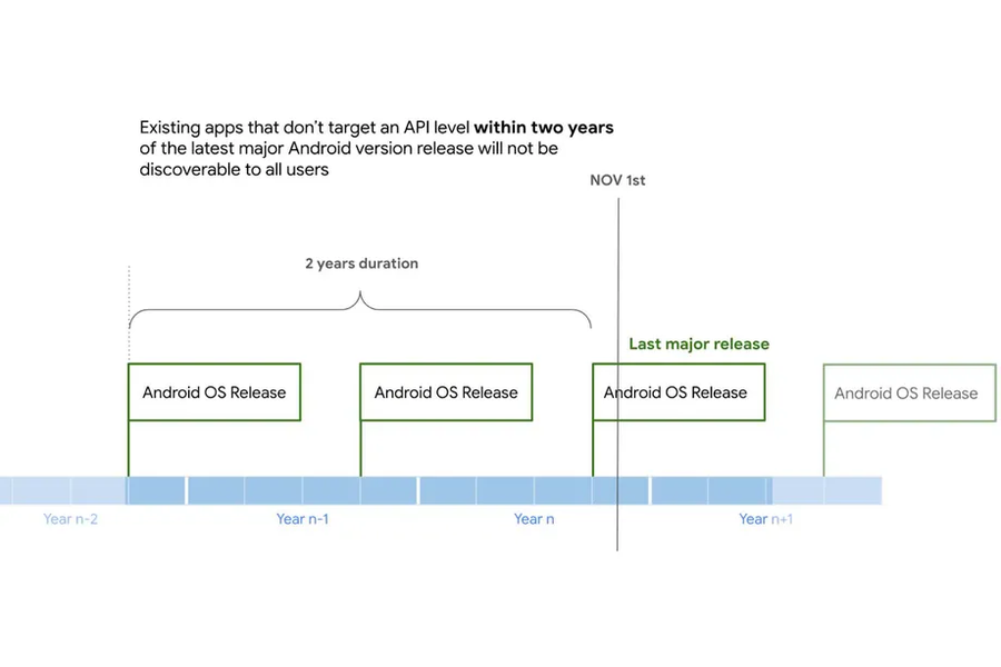 С 1 ноября 2022 года все приложения в магазине должны соответствовать уровню API не старше двух лет с момента выпуска свежей основной версии операционной системы Android. Если разработчики не приведут приложения в соответствие этим требованиям, Google ограничит для пользователей возможность находить их и устанавливать.