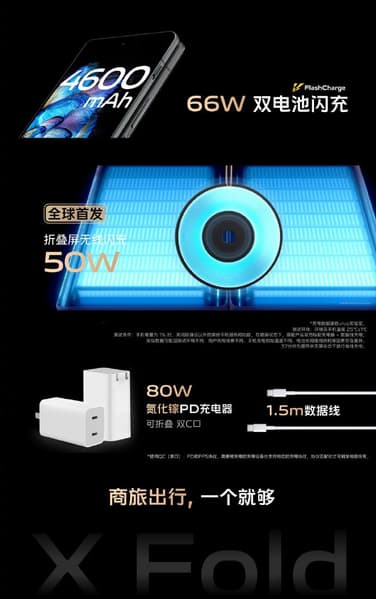 Vivo X Fold базируется на однокристальной системе Qualcomm Snapdragon 8 Gen 1, оснащён аккумуляторной батарей ёмкостью 4600 мА·ч с поддержкой проводной зарядки мощностью 66 Вт, беспроводной — мощностью 50 Вт, обратной беспроводной — мощностью 10 Вт.