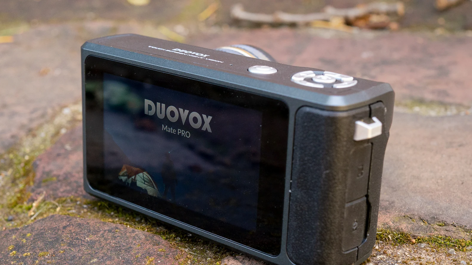 В верхней части Duovox Mate Pro есть шесть кнопок, включая питание и затвор. Настройками управлять можно с помощью 3-дюймового сенсорного экрана на задней панели камеры. На правой стороне камеры есть порт USB-C и слот для карты microSD, в который можно установить карту объёмом до 512 ГБ.