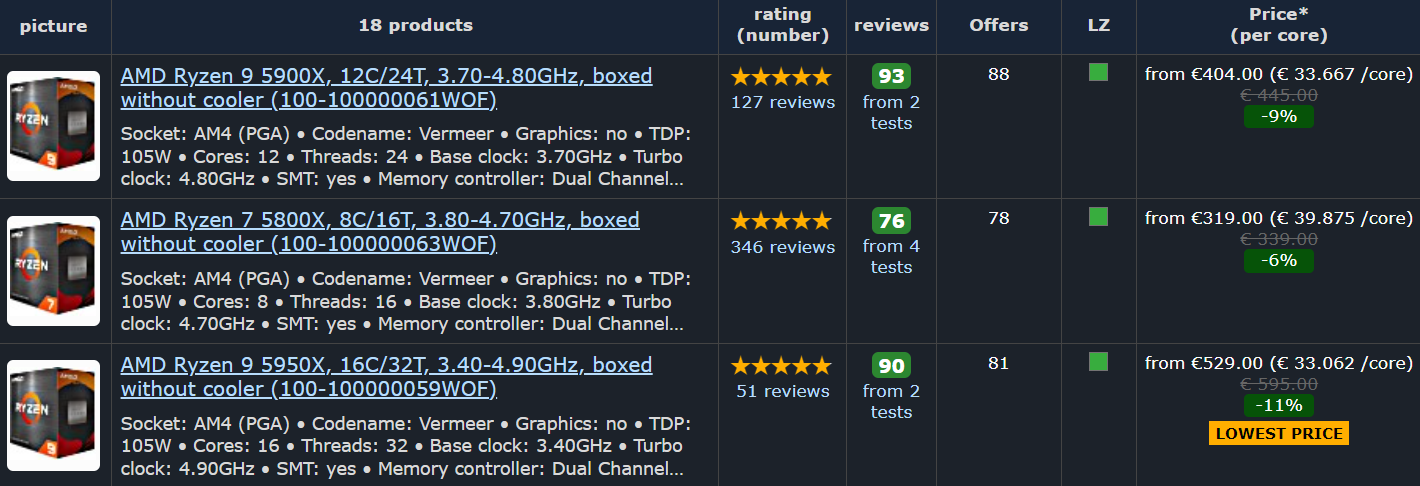 Что касается Европы, то тут тоже очень хорошие предложения на Ryzen 5000. Так, в немецком агрегаторе Geizhals обнаружились предложения Ryzen 9 5950X за 530 евро, Ryzen 9 5900X за 405 евро и Ryzen 7 5800X за 320 евро.