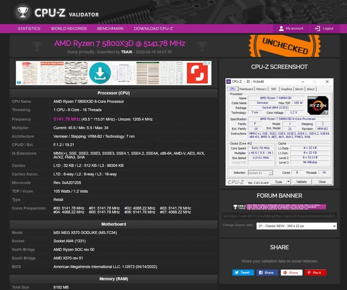 Чтобы достичь частоты 5,14 ГГц, понадобилось поднять частоту шины до 113,01, а множитель увеличить до 45,5х. Интересно, что напряжение при этом оказалось равным всего 1,2 В. Результат задокументирован, однако есть один момент, обращающий на себя внимание: тесты на производительность разогнанной системы не проводились, так что непонятно, насколько стабильно работает Ryzen 7 5800X3D с таким разгоном.