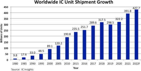 Оценить рост отрасли позволяет такое сопоставление: ожидается, что в этом году будет отгружено почти в пять раз больше микросхем, чем в 2000 году, и почти в 44 раза больше, чем было отгружено в 1980 году. Наглядное представление даёт диаграмма, опубликованная IC Insights.