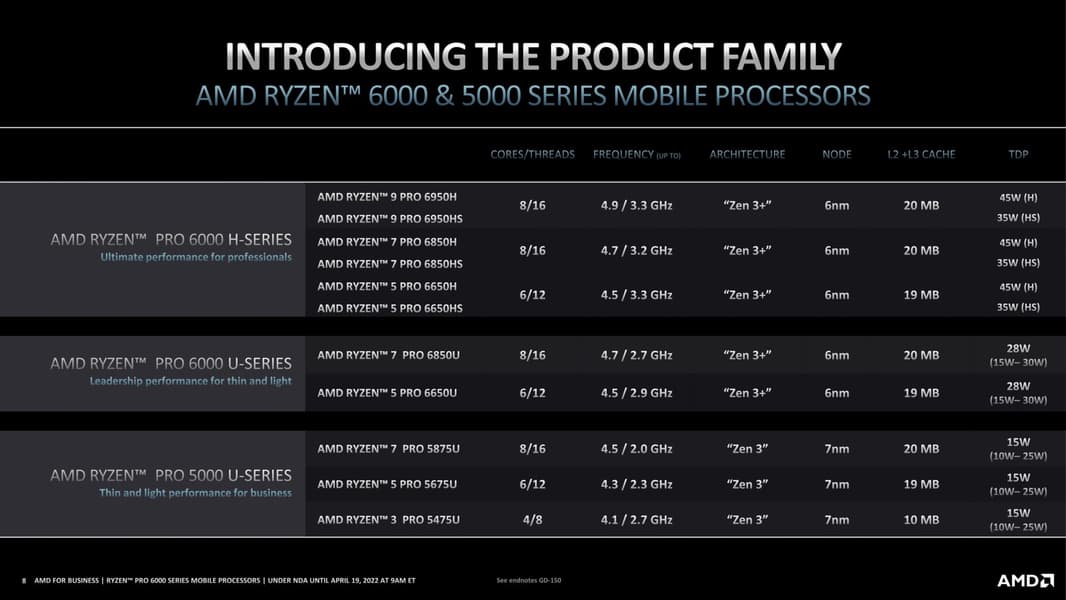 Линейка Ryzen Pro 6000 включает всего две энергоэффективных модели и сразу шесть высокопроизводительных — всё как и в случае обычных Ryzen 6000. Разве что названия некоторых моделей немного иные.