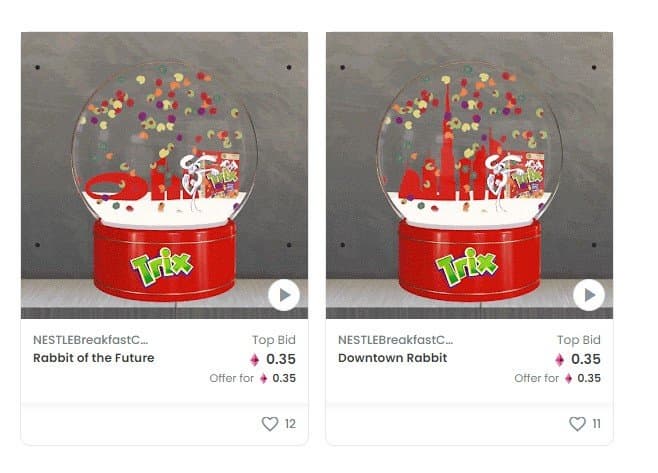 В ознаменование запуска бренда TRIX Breakfast Cereal в странах Ближнего Востока и Северной Африки Nestle разместила NFT на Opensea.io, а торги пройдут с 18 марта по 13 мая. Вырученные средства пойдут на благотворительность.