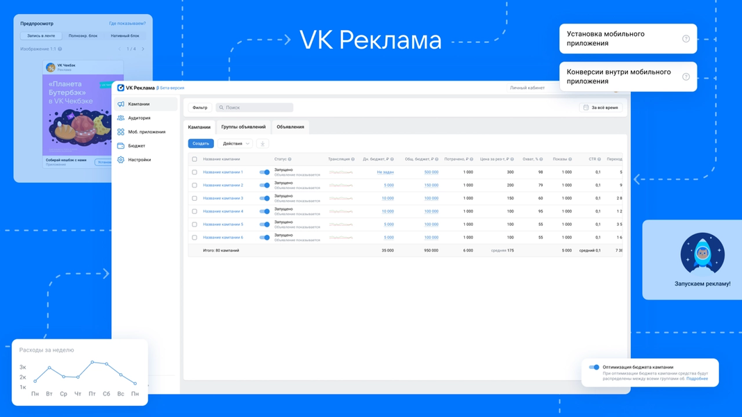Как обещают разработчики, платформа предоставит рекламодателям доступ ко многомиллионной аудитории экосистемы VK и рекламной сети. На первом этапе в бета-версии платформы можно продвигать мобильные приложения. В «VK Рекламе» можно использовать один из двух рекламных кабинетов: для тех, кто самостоятельно запускает продвижение, или для агентств.