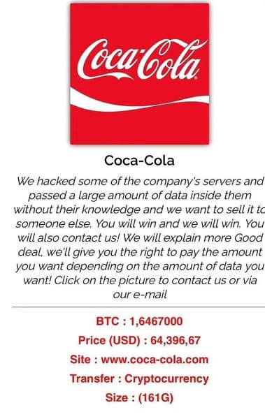 Хакерская группировка Stormous, которую связывают с Россией, заявила о взломе серверов Coca-Cola и хищении большого количества данных – 161 ГБ, в том числе финансовых документов, паролей, учетных записей и прочей конфиденциальной информации. Эти данные уже предложены для выкупа заинтересованным – полностью или по частям. Плату, разумеется, требуют в биткойнах. Однако аналитики сомневаются, что такой взлом действительно имел место, так как репутация Stormous неоднозначная.