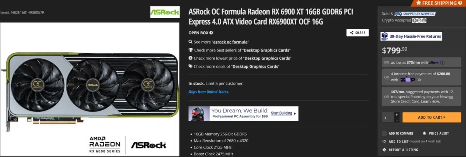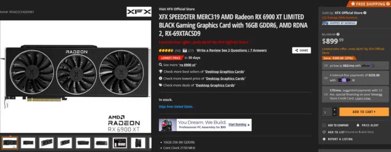 Американская онлайновая площадка Newegg предлагает топовую видеокарту Radeon RX 6900 XT за 800 долларов – это на внушительные 200 долларов ниже рекомендованной розничной цены. Еще полгода тому назад о том, что цены упадут до такого уровня, сложно было подумать.