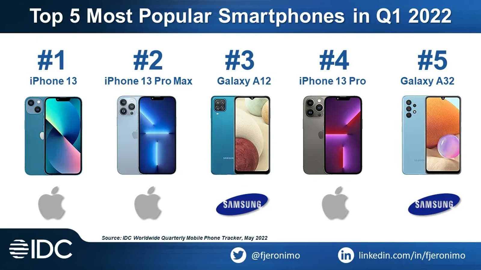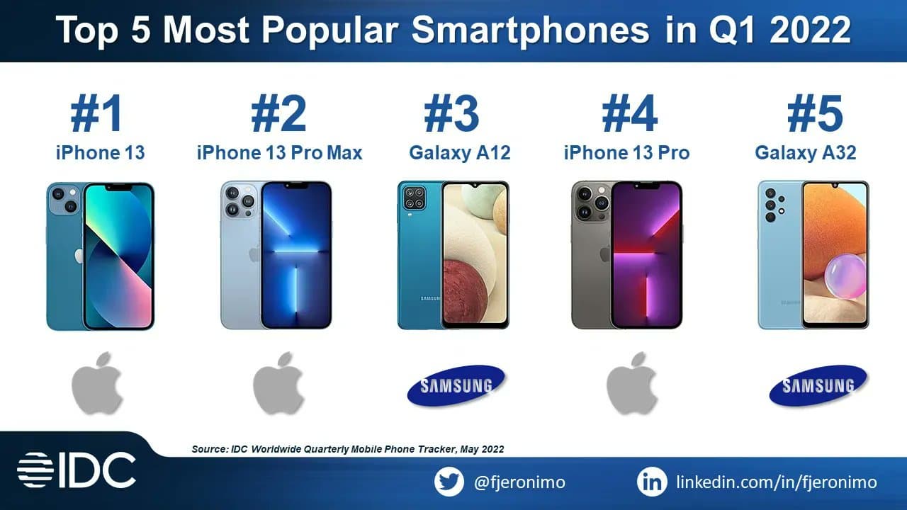 Согласно данным IDC, самым популярным смартфоном в мире в этом году (в первом квартале) стал iPhone 13. На втором месте – iPhone 13 Pro Max, а на четвертом – iPhone 13 Pro. В общем, текущей линейке смартфонов Apple равных нет.