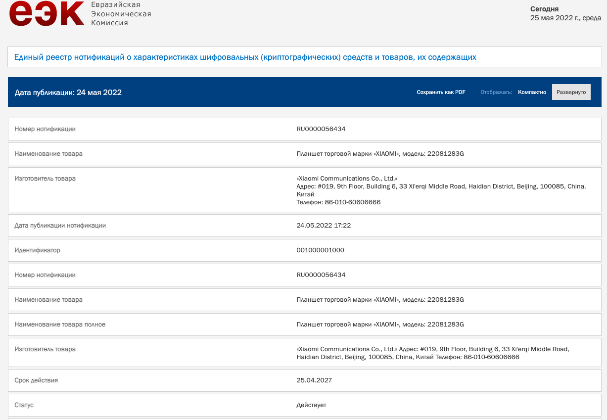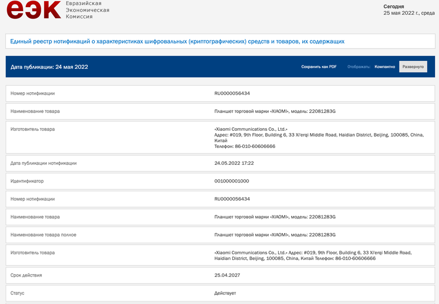 На документы изначально обратил внимание тематический неофициальный канал Xiaomiu. Сертификацию ЕЭК прошла модель под маркировкой 22081283G. Отмечается, что первые четыре цифры (2208) говорят о вероятном сроке официального дебюта — август 2022 года. В документации также подтверждается, что речь идёт именно о планшете, а не о каком-то другом устройстве из экосистемы Xiaomi.