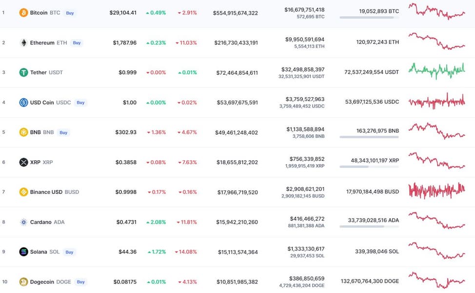 За неделю в топ-10 на те же 11% упала Cardano, а больше всего потеряла Solana – минус 14%. Dogecoin и BNB умеренно снизились на 4 с лишним процента.