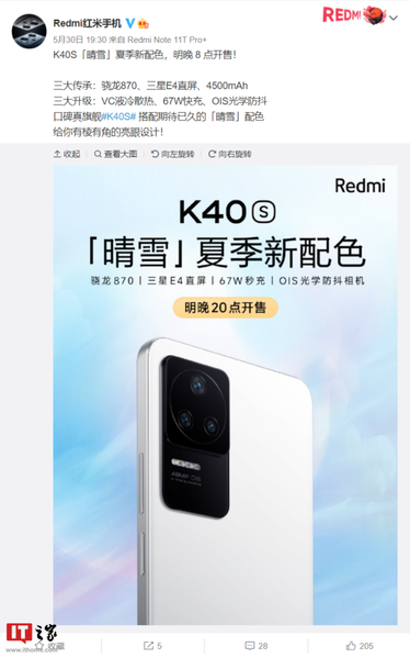 Компания Xiaomi сообщила о поступлении в продажу новой версии смартфона Redmi K40S в белом цвете. Версия с 8 ГБ ОЗУ и 256 ГБ флеш-памяти предлагается за 329 долларов, а версия с 12/256 ГБ стоит 359 долларов.