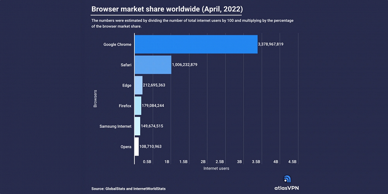 Команда AtlasVPN опубликовала интересную статистику — эксперты подсчитали количество пользователей разных браузеров по всему миру.