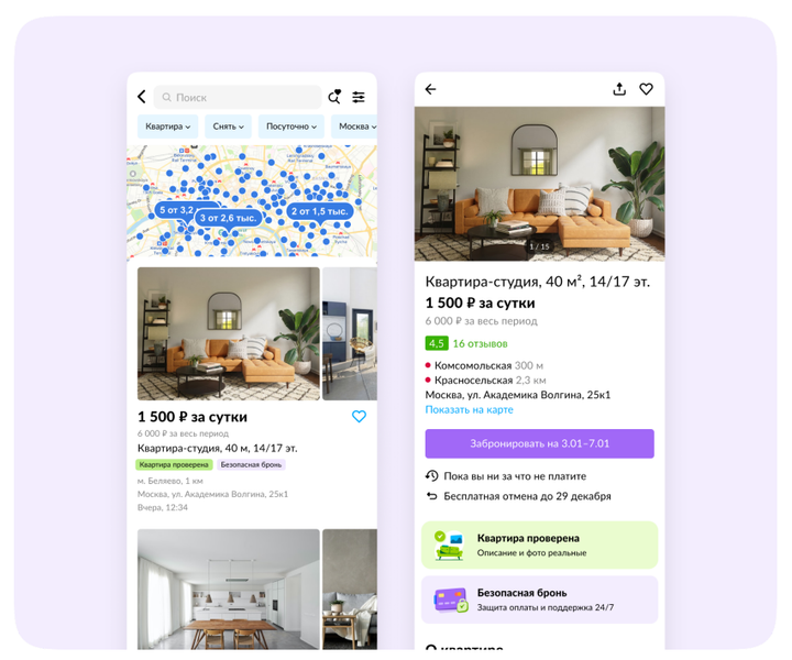 Опция доступна для объектов с отметками «Квартира проверена» и «Безопасная бронь». Гости получают возможность безопасно и без звонков забронировать жилье: в течение четырех часов арендодатель рассматривает и подтверждает бронирование.