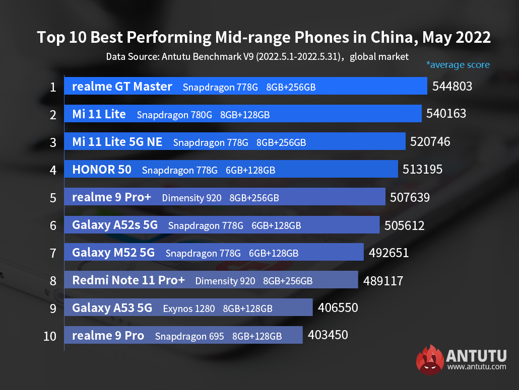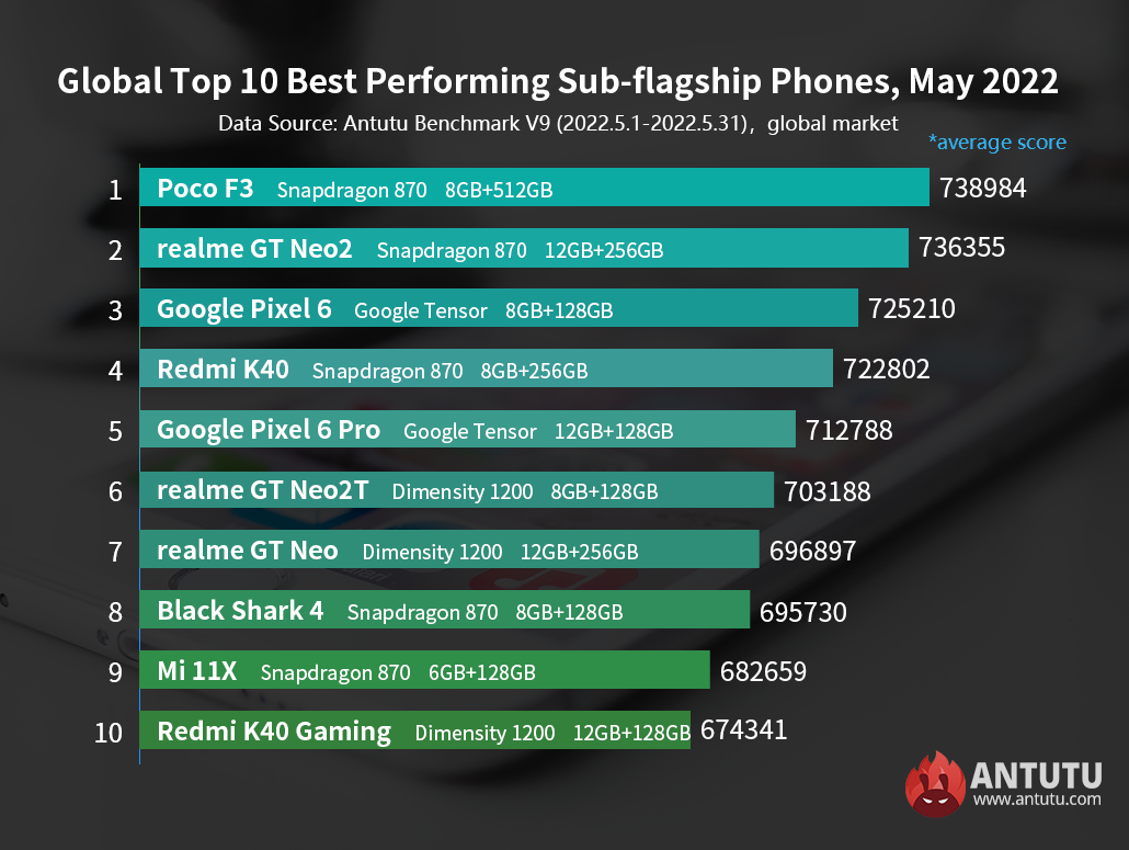 Статистика собрана в период с 1 по 31 мая 2022 года. В рейтинге AnTuTu используются средние, а не самые высокие результаты. Для каждого смартфона учитывались результаты не менее 1000 тестов — модели с меньшим количеством тестов в рейтинг не попадают.