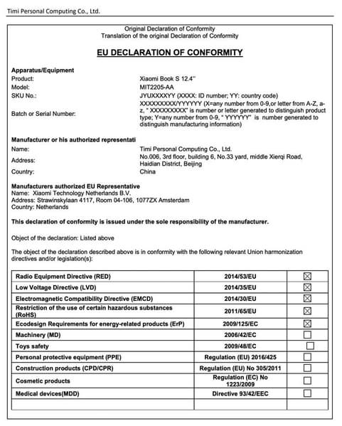 Как оказалось, это не совсем так. Судя по европейской декларации соответствия DoC (EC Declaration of Conformity), которую опубликовала сама Xiaomi, включая и первую фотографию — Xiaomi Book S относится к классу гибридных планшетов. То есть Xiaomi Book S можно использовать просто как планшет, а можно подключить аппаратную клавиатуру.