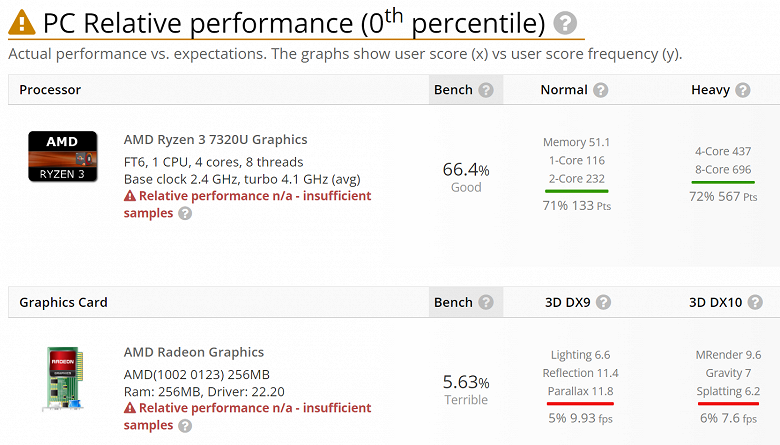 В итоге по своей конфигурации новый APU напоминает Ryzen 3 4300U. У последнего также четыре ядра Zen 2, но частоты ниже и нет поддержки SMT. То есть Ryzen 3 7320U должен быть быстрее. Также можно ожидать, что Ryzen 3 7320U будет производительнее любой мобильной модели линейки Ryzen 3000U, так как у последних более старая архитектура и старый техпроцесс.