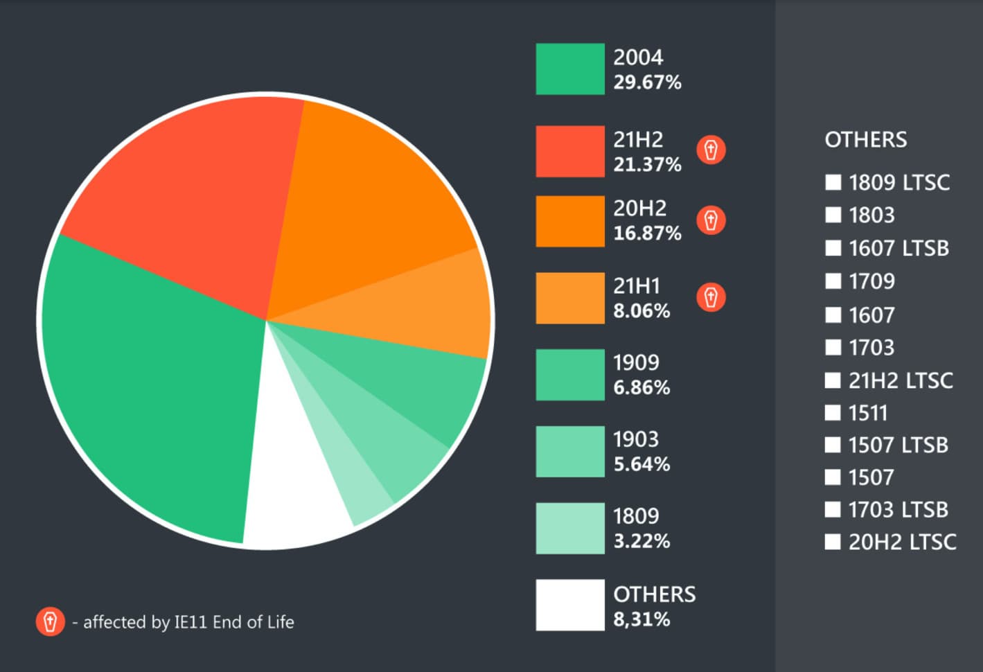 Отметим, что в данном случае это не обязательно означает непосредственное использование Internet Explorer. Речь идёт о доле актуальных версий Windows 10 в корпоративных средах, которые тем или иным образом связаны с любым сценарием использования IE11.