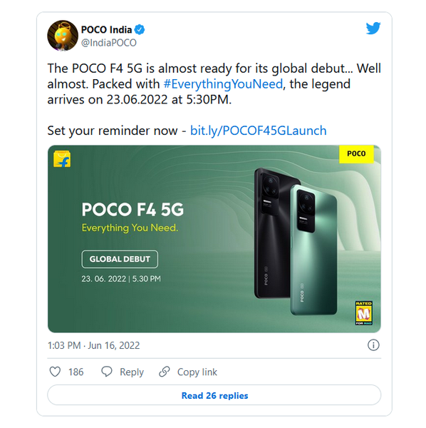 Официальный Twitter-аккаунт индийского подразделения POCO сообщил о дате запуска смартфона POCO F4 5G. Он должен дебютировать в Индии и на мировых рынках через неделю, 23 июня.