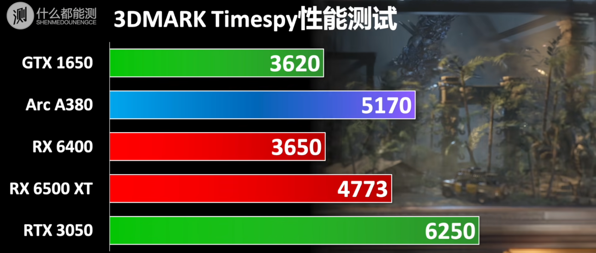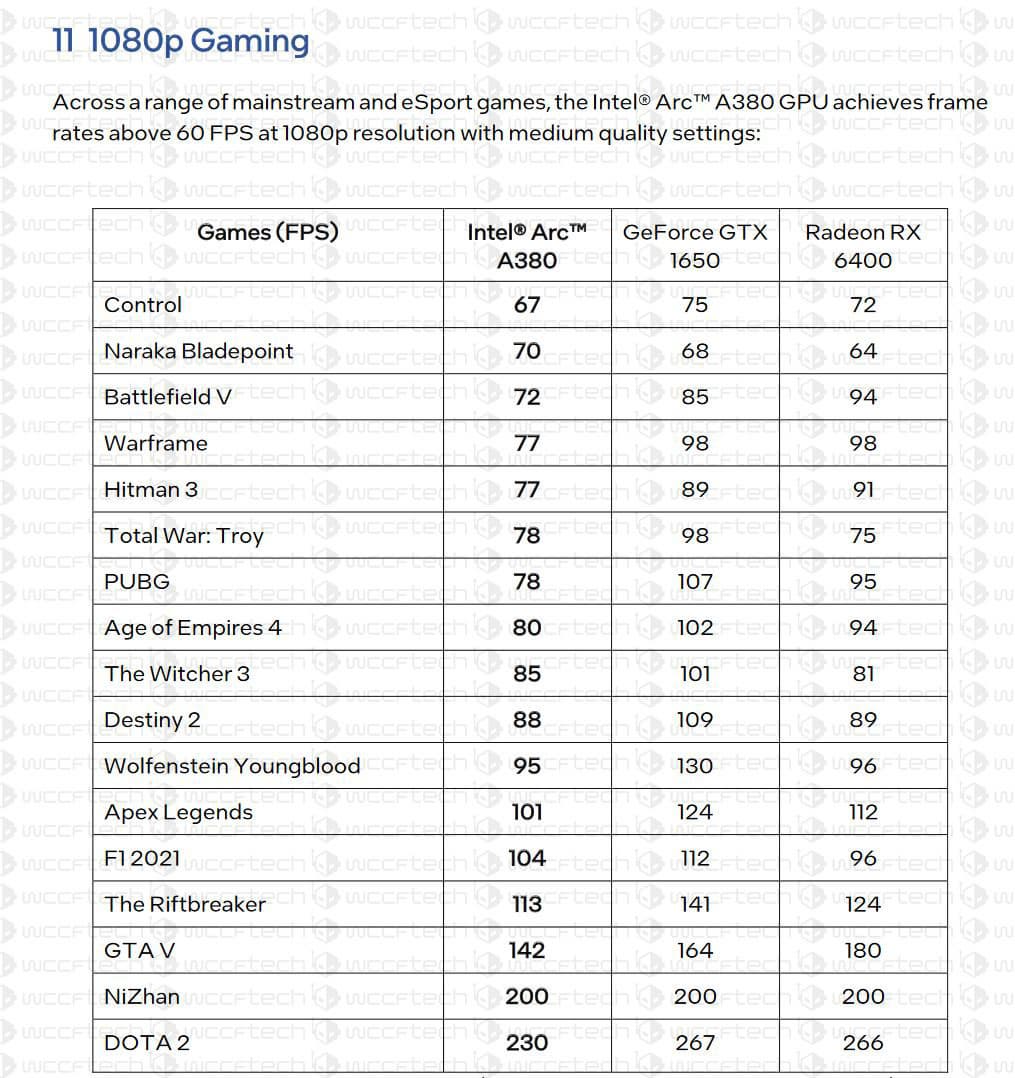 При этом первые игровые тесты от энтузиастов показали существенное отставание карты в играх от AMD RX 6400 и Nvidia GTX 1650. Однако официальные тесты дают немного иную картину. Судя по ним, Intel Arc A380 превосходит RX 6400 в Total War: Troy, Naraka Bladepoint, The Witcher 3 и F1 2021.