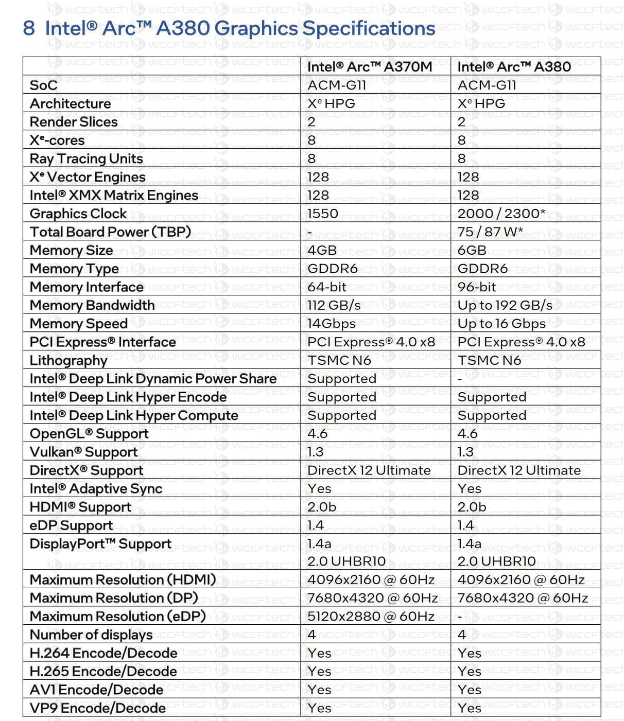 В сети появились официальные характеристики видеокарты Intel Arc A380. Судя по ним, графический чип выполнен по техпроцессу TSMC N6. Чип оснащён 1024 ядрами FP32 (каждое ядро Xe имеет по 128 ядер FP32) и 6 ГБ памяти GDDR6 с тактовой частотой 16 Гбит/с. Шина данных — 96 бит, что даёт на выходе пропускную способность в 192 ГБ/с.