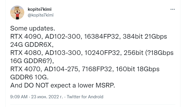Полная конфигурация графического процессора AD102 предположительно имеет 144 ядра, но этот вариант, скорее всего, будет зарезервирован для будущих карт Titan или RTX 4090 Ti. Другие данные не изменились. RTX 4090, по словам Kopite7kimi, получит 24 ГБ памяти GDDR6X с тактовой частотой 21 ГГц и теплопакет в 450 Вт.