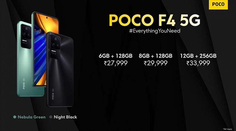 Цены уже озвучены как для рынка Индии, так и для глобального рынка. В Европе Poco F4 5G будет представлен двумя версиями — 6/128 ГБ за 400 евро и 8/256 ГБ за 450 евро. Но для первых покупателей действует скидка в размере 50 евро. В Индии предложены три версии: 6/128 ГБ (360 долларов), 8/128 ГБ (385 долларов) и 12/256 ГБ (435 долларов). Тут тоже первым покупателям обещана скидка в размере 50 долларов.