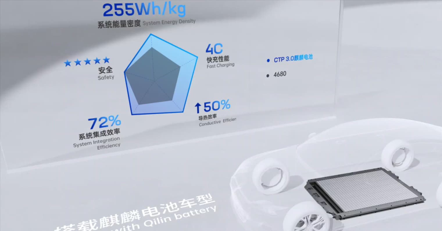 Компания CATL — известный китайский производитель тяговых аккумуляторных батарей для электромобилей — анонсировала батареи нового поколения под названием Qilin. Они отличаются эффективностью использования объема (72% — и, по словам производителя, это мировой рекорд), а также высокой плотностью энергии — до 255 Вт·ч/кг. Ячейки Qilin способны хранить на 13% больше энергии, чем ячейки 4680 в электромобилях Tesla.
