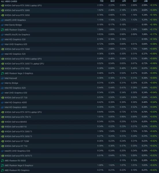На третьем месте – GeForce RTX 3050. Месячная прибавка невелика – 0,18%, но эта модель последовательно прирастала аудиторией с начала года – и вот результат. Еще одна дискретная 3D-карта в июньском топ-10 Steam – это GeForce GTX 1660, все остальные – встроенные в CPU GPU.