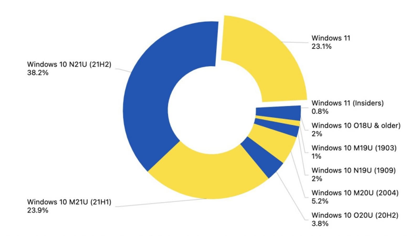 Более того, если сложить долю стабильной Windows 11 и ее тестовых версий, то получится 23,9% – ровно такую же долю занимает Windows 10 21H1 – вторая по распространенности версия Windows 10. Первое же место незыблемо занято 10 21H2, которая за эти два месяца только упрочила свои позиции – доля увеличилась с 35% до 38,2%.