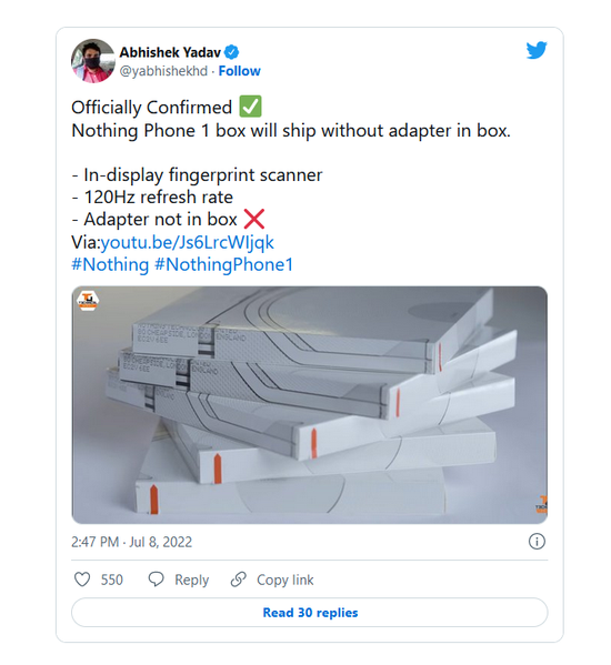 Новый смартфон Nothing Phone (1) будет похож на iPhone не только дизайном. Как сообщил инсайдер Абишек Ядав, новинка не получит комплектного зарядного устройства. Он также подтвердил, что смартфон оснастят экраном с частотой обновления изображения в 120 Гц со встроенным сканером отпечатка пальца.