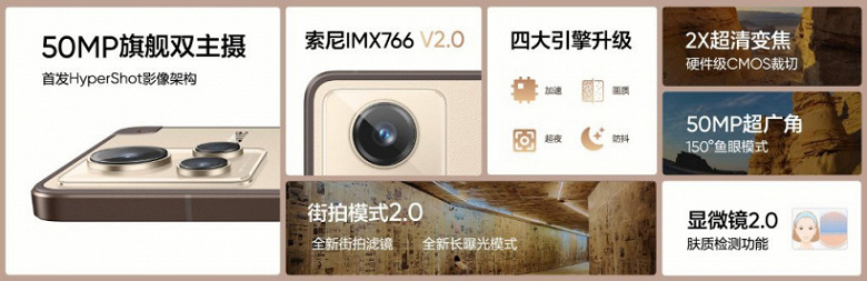 Фронтальная камера модели 16-мегапиксельная. Основная представлена тремя модулями: в основном — 50-мегапиксельный сенсор Sony IMX766, широкоугольный объектив и система OIS. Во втором — тоже 50-мегапиксельный датчик и сверхширокоугольный объектив, в третьем — 2-мегапиксельный сенсор и объектив-микроскоп с 40-кратным увеличением.