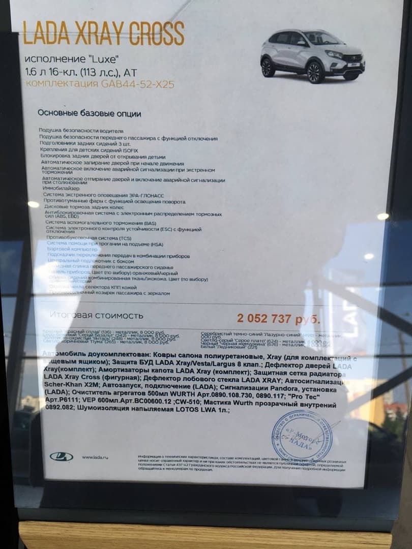 Один из салонов ООО «Р-Моторс Лада» продаёт кроссовер Lada Xray Cross по цене 2 052 737 рублей.