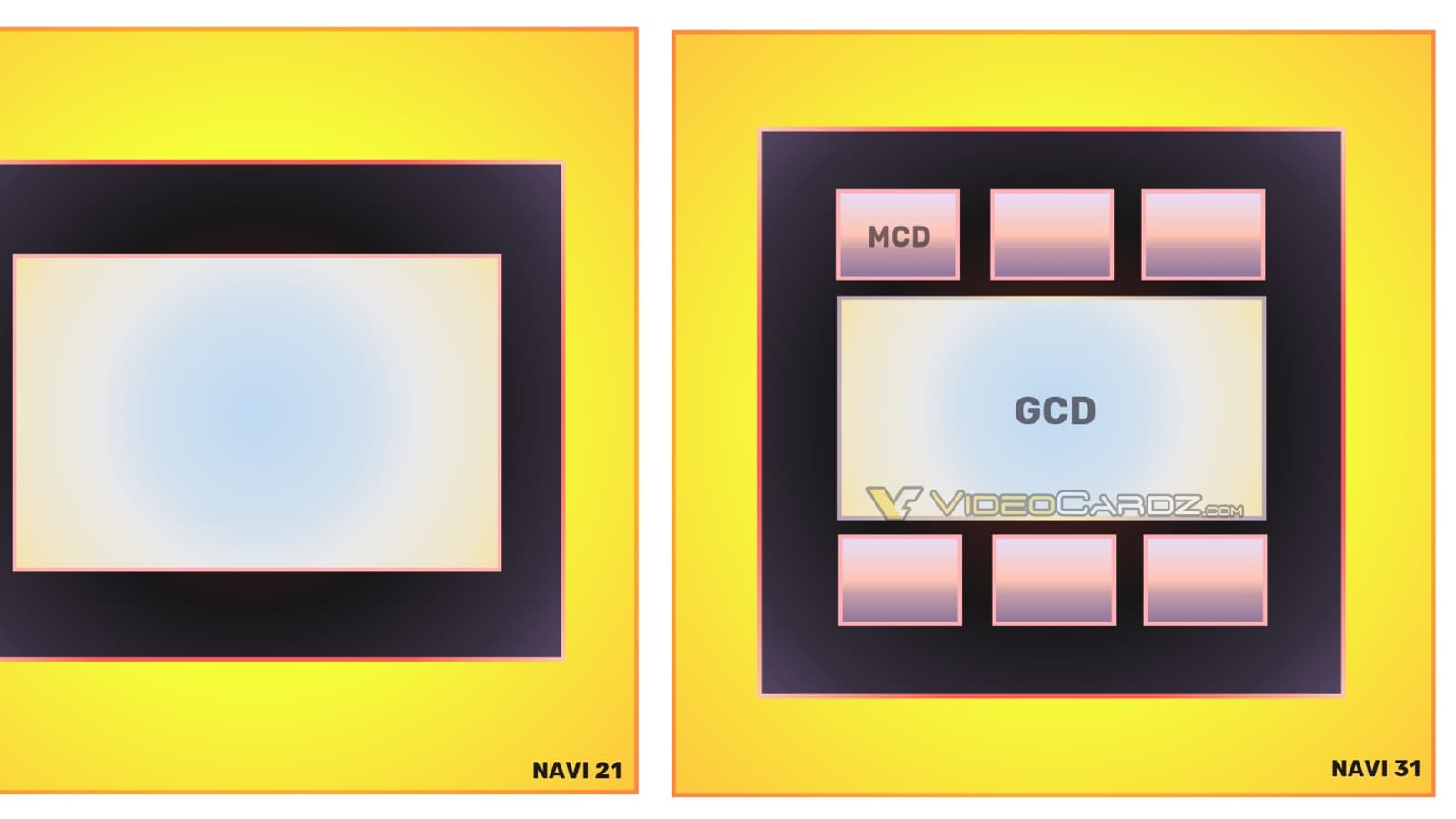 Как мы недавно узнали, Navi 31 будет весьма необычным GPU. Вопреки огромному количеству ранних слухов и утечек, он не будет двухкристальным. Вместо этого непосредственно GPU будет монолитным и небольшим, но вокруг него расположится шесть кристаллов MCD (Memory Complex Die). Это просто кеш-память, которая вынесена в отдельные чипы. Причём три из шести чипов могут иметь ещё дополнительные чипы, размещённые сверху или снизу посредством 3D V-Cache.