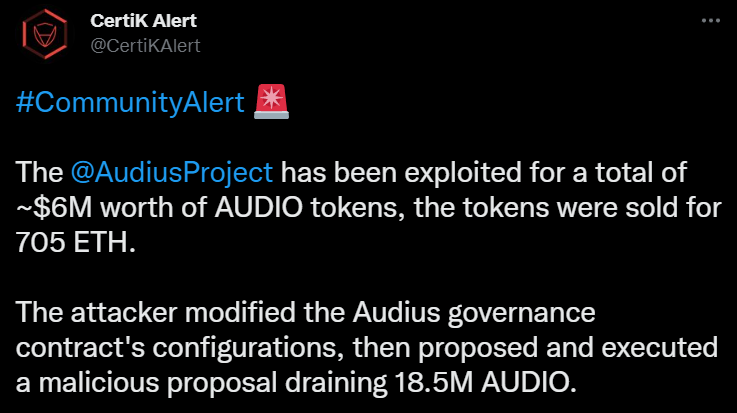 Неизвестный смог поменять в смарт-контракте Audius данные о времени голосования по предложению, а также задержку на исполнение результата голосования. По итогу махинаций злоумышленник вывел похищенную криптовалюту на продажу, однако из-за проскальзывания рынка смог продать криптовалюту стоимостью в $6 млн лишь на $1,1 млн в Ethereum.
