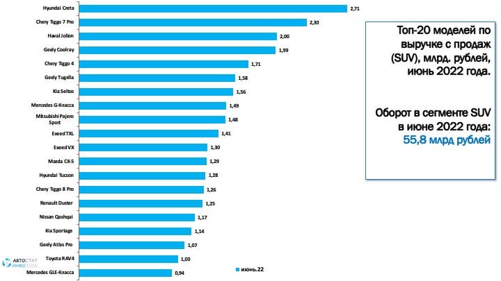 Возглавляет рейтинг по объёмам денежного оборота модель Hyundai Creta, продажи которой в июне составили 1290 машин, а оборот от продажи такого количества кроссоверов составил 2,7 млрд рублей.