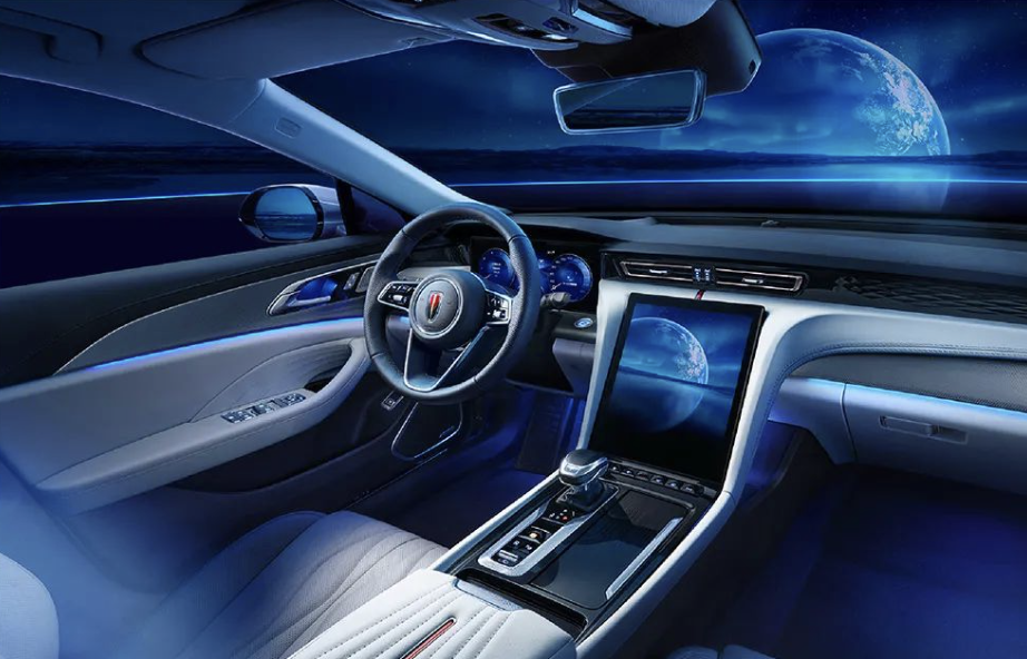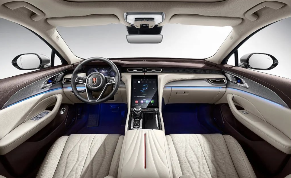 Внутри Hongqi H5 есть все, что ожидаешь от премиального седана: запуск двигателя со смартфона, виртуальная комбинация приборов, большой экран (с диагональю 12,3 дюйма, установлен вертикально) на передней панели, атмосферная подсветка, панорамная крыша и т.д.
