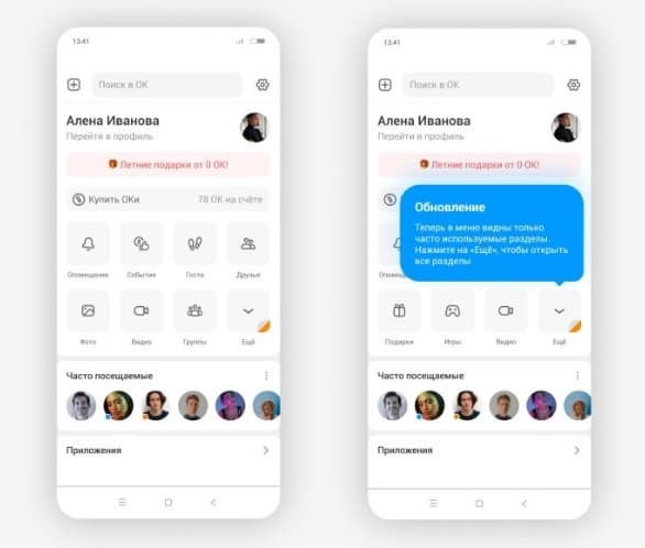 Социальная сеть «Одноклассники» представила крупное обновление в интерфейсе своих мобильных приложений. Теперь меню подстраивается под интересы пользователей, а навигация стала более удобной. Для нового меню ОК определили наиболее важные для всех пользователей разделы: «Оповещения» — с самыми важными уведомлениями от соцсети, «События» — с «классами» и комментариями под публикациями пользователя, сервисы «Гости» и «Друзья», которые позволяют взаимодействовать с друзьями в соцсети. Эти сервисы будут занимать первую строчку меню.