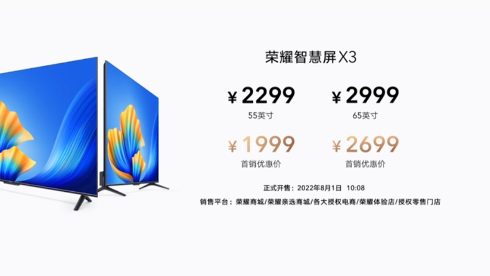 Honor представила недорогие телевизоры Smart Screen X3 21 июля, а сегодня они поступили в продажу в Китае. Устройства получились недорогими: за младшую модель с экраном диагональю 55 дюймов просят 295 долларов, старшая, 65-дюймовая, оценена в 400 долларов. Поставки заказанных устройств будут осуществляться в Поднебесной с 1 августа.